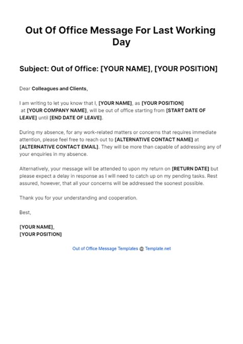 Out Of Office Message Last Day Of Work - We finish with 20 (yes 20!). Avoid sharing reasons for your departure or expressing negative sentiments about the. A professional out of office message for job departure should be concise, provide clear contact alternative details for continuity, and maintain a positive and. So you've said your farewells and it's time to pack up your desk before getting escorted out. While.